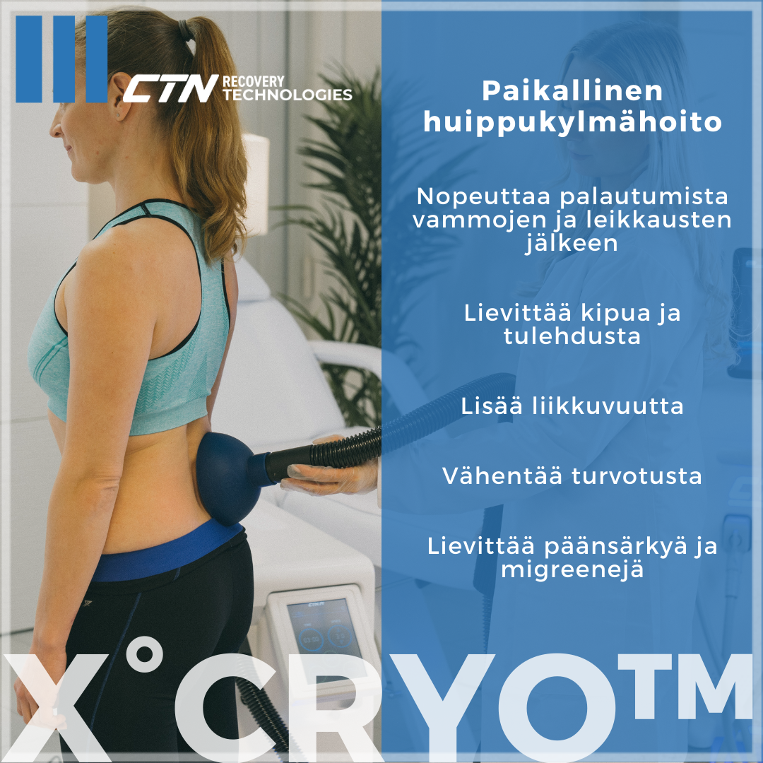 X°CRYO™ nopeuttaa lihasten palautumista, vähentää maitohappojen määrää, parantaa lihasten liikkuvuutta ja yleistä elastisuutta. Huippukylmähoito auttaa useimpiin urheiluvammoihin, kipuihin, nyrjähdyksiin, venähdyksiin ja pehmytkudoskipuihin.