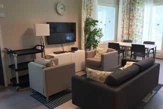 Attendo-kodissa on kolme viiden asukkaan ryhmäkotia. Asunnot ovat noin 21 m2 kokoisia ja asukkaat kalustavat asuntonsa omilla tutuilla kalusteillaan kodinomaisuuden tukemiseksi. Yhteisissä oleskelu- ja ruokailutiloissa viihdytään yhdessä ja harjoitellaan erilaisia arjen toimia. Itsenäisemmin pärjääville asukkaille Attendo-kodin pihapiirissä on yhteisöllisen asumisen asunnot, joissa on 32 m2 kokoiset kaksiot. Asunnoissa on olohuone-keittiö, makuuhuone sekä invamitoitettu wc-suihku.